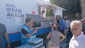 Cumhuriyet Meydanında görücüye çıkan Mobil İkram Evinde Cuma Namazı çıkışında vatandaşlara kavurma, pilav ve ayran ikram edildi.