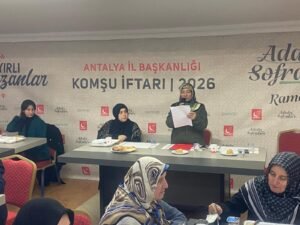 Programda konuşan Kadın Kolları Antalya İl Başkanı Zübeyde Güler, vefa, sadakat ve dava bilinci vurgusu yaparak “Bugün burada; geçmişimize duyduğumuz sadakati, emek verenlerimize olan vefamızı ve davamıza olan bağlılığımızı yeniden hatırlamak için bir araya geldik. Bu gece, verilen sözlerin, dökülen alın terinin ve samimiyetle yürünmüş yolların hatırlandığı bir ahde vefa gecesidir” ifadelerini kullandı.