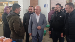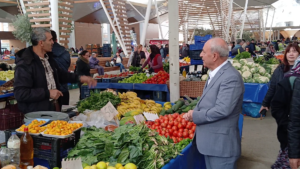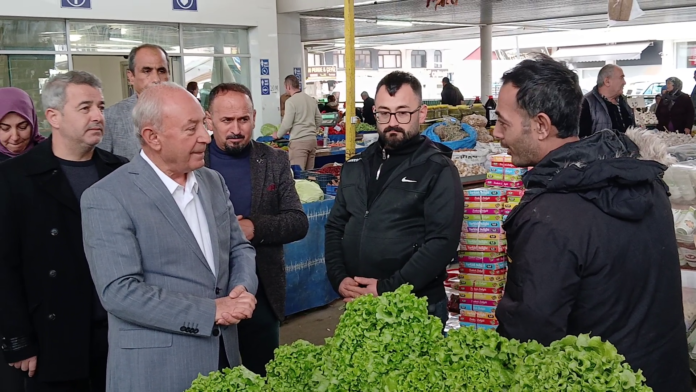 Pazarcı esnafının tek tek elini sıkan, hatırını soran başkan Adayı Doğan ve ekibi, esnafın şikâyetini dinledi, notlar aldı.